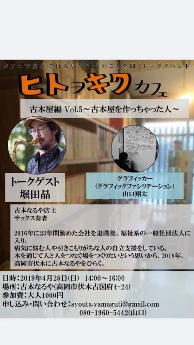 ヒトヲキクカフェvol.5のご案内 開催終了しました 2019年04月28日 ヒトヲキクカフェvol.5 古本屋編~古本屋を作っちゃった人~ 日時 2019年4月28日(日)14時より 場所 古本なるや 参加費 1500円