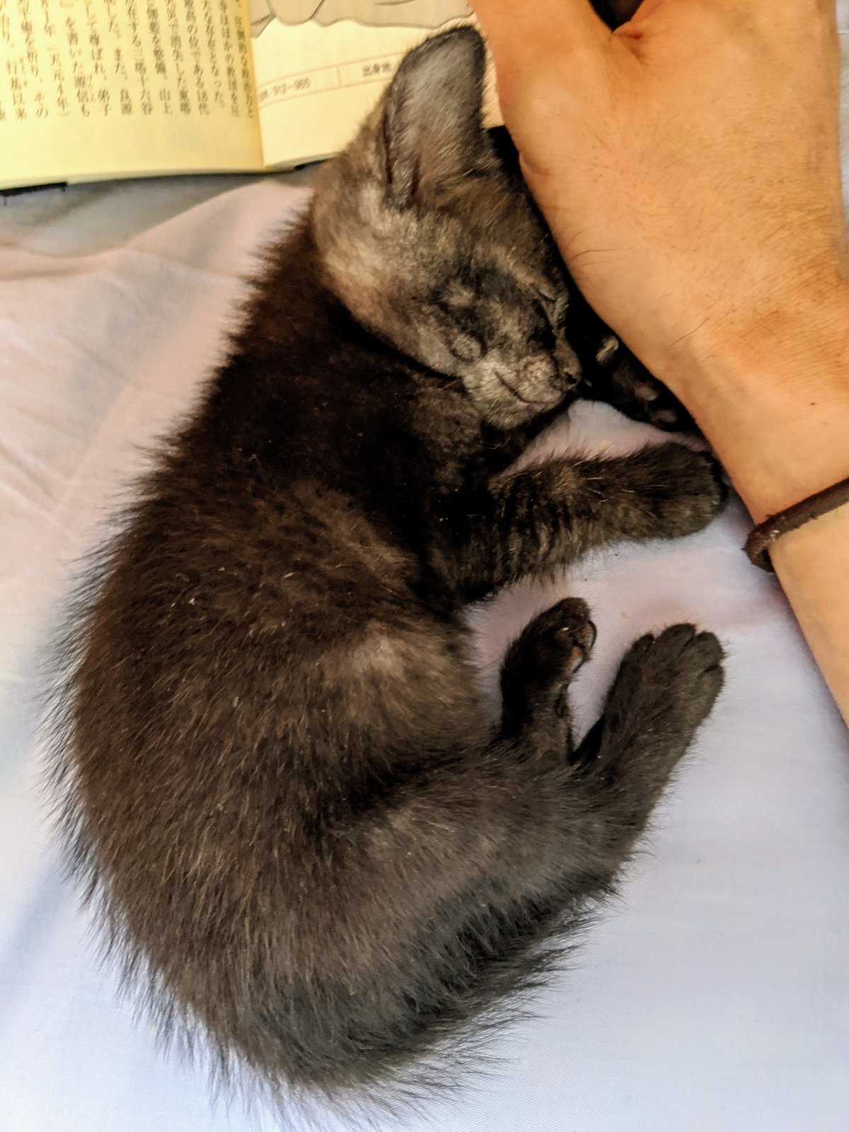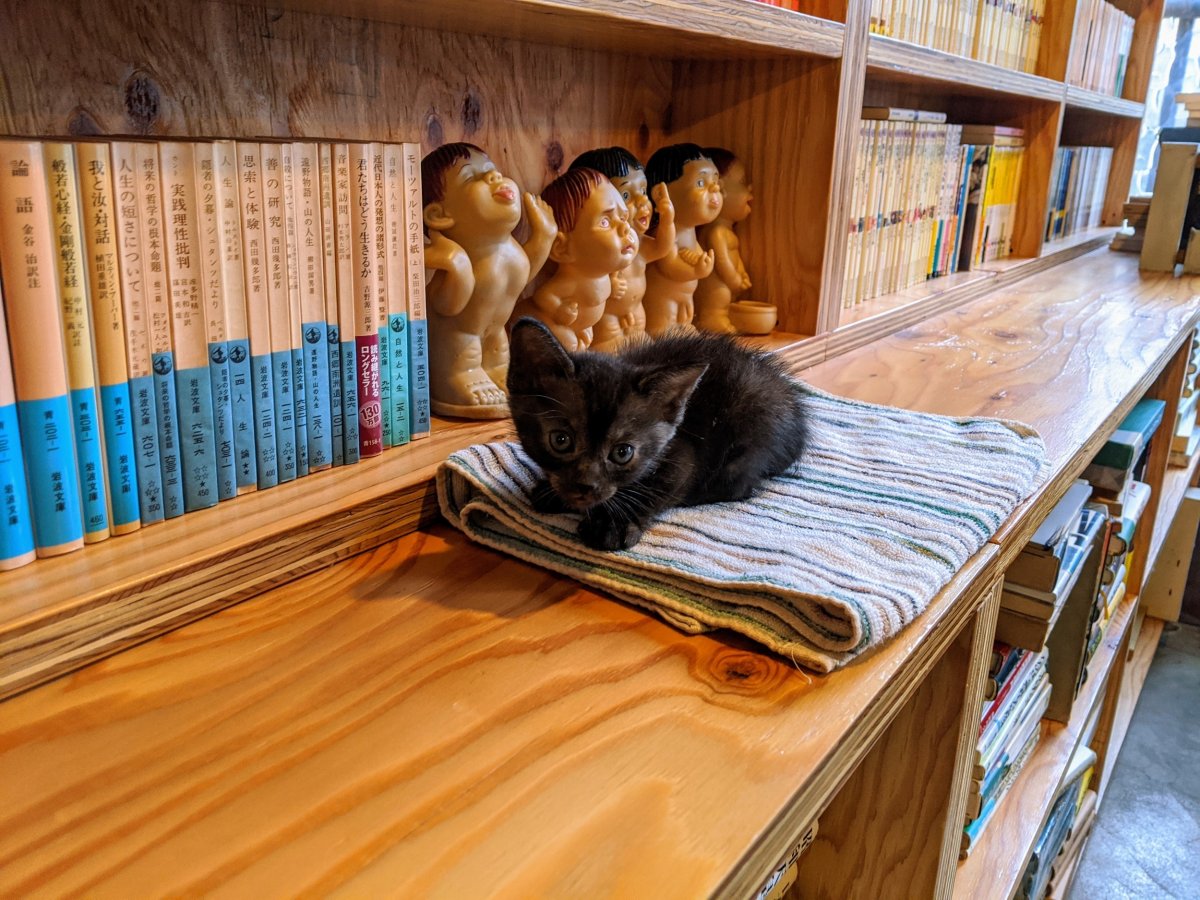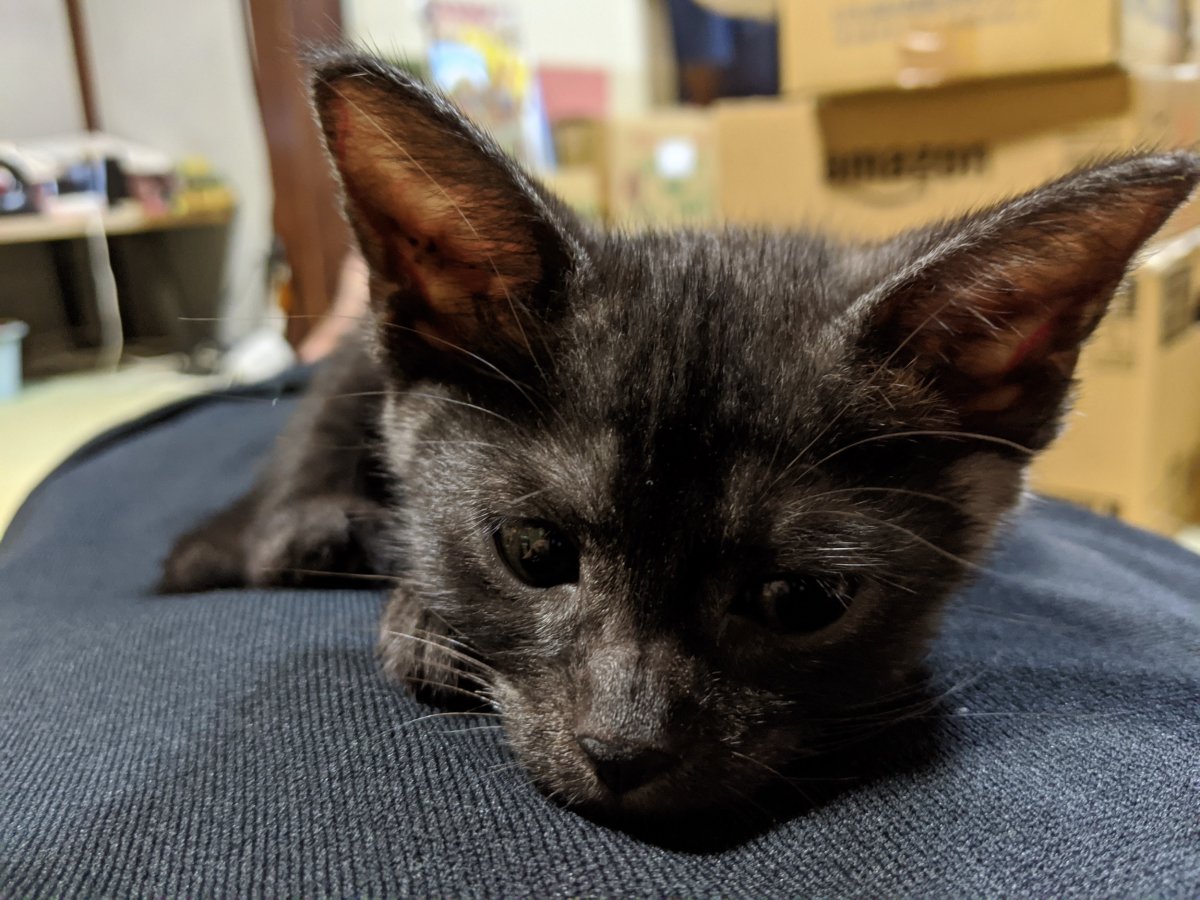 品物の並べ替えや梱包作業の邪魔を覚え始め、おじさんふて寝中の図。喉に違和感があるらしく、保護当時からの擦れた鳴き声は「もしかするとこのまま続くことになるかも」と岩本先生に言われちょっと寂しくなる。が、元気は果てしなくあり仕事の邪魔ばかりしてくるためおじさん本気でケンカをし始める。夜遊びも盛んになり始め、おじさんの寝顔の上を軽快に駆け抜けるようになる。ウェットフード。まだ「ホリタミミちゃ~ん」と呼ばれる度に恥ずかしい気持ちになる。