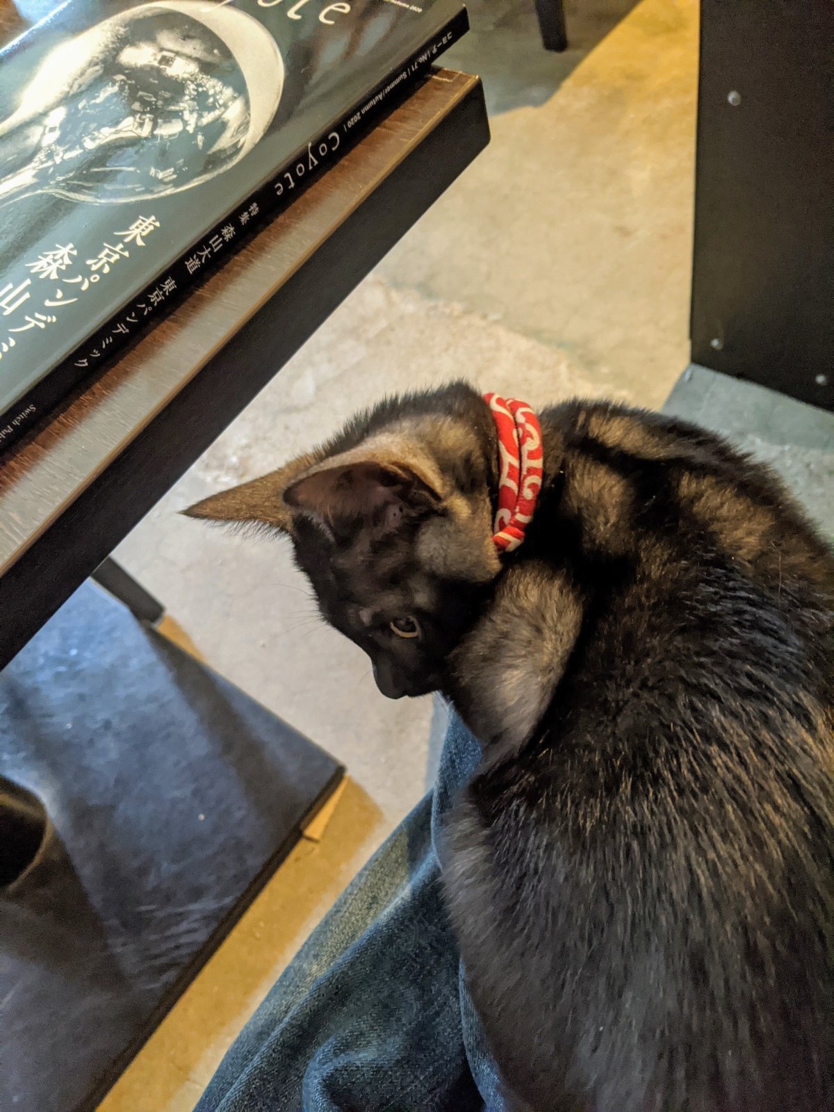 生後約3か月、体重約1.3kg。少々ふてぶてしくなり始める。三度の飯の次に人の邪魔をすることに生き甲斐を感じたらしく、油断をするとすぐこうなる。看板猫も板につき、お客さんからの差し入れが始まると同時におじさんへの差し入れが減り始める。ウェットフード。