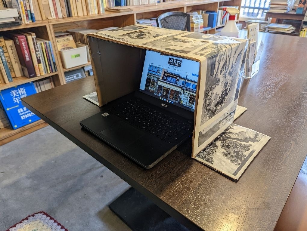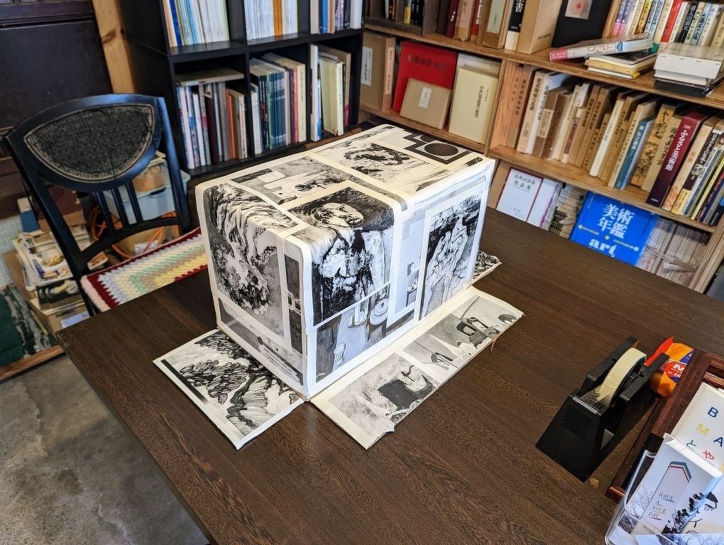 段ボールそのままの外観は味気なかったのでダメージの大きかった図録を切り貼りしてなんとなく衣替え。まさか中で水着のお姉さんが踊っているとは誰も思うまい。